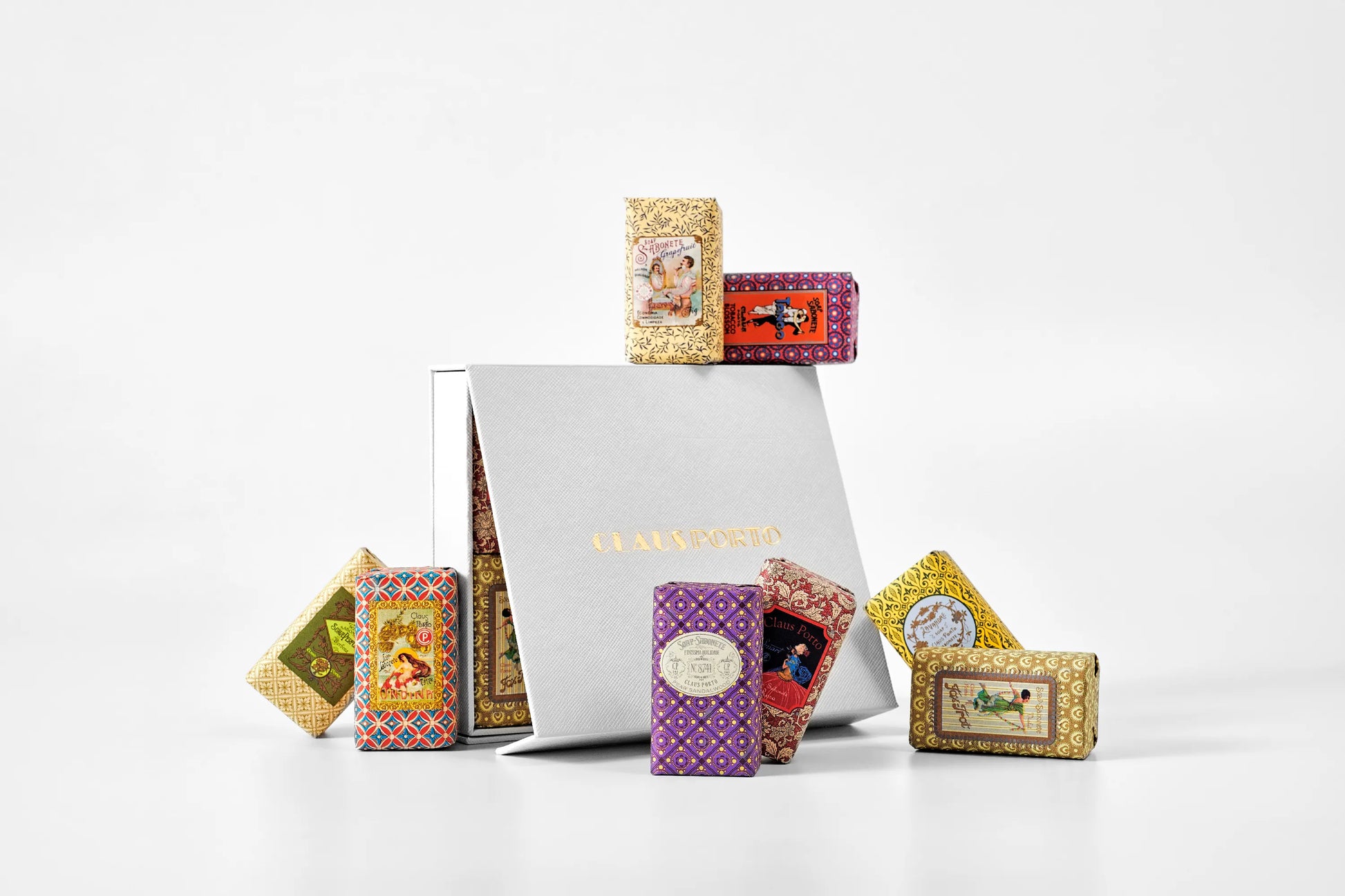 Colorata e accattivante, la nostra nuova confezione regalo Classico Fantasia è una scatola di meraviglie. I 135 anni di storia di Claus Porto sono raccontati attraverso etichette dettagliate e profumi ricchi che faranno sognare un'epoca diversa e viaggeranno in diversi momenti nel tempo. Questa elegante scatola bianca, con goffratura dorata, si apre per presentare otto raffinati saponi avvolti in confezioni vintage ispirate a Belle époque, e che fanno parte della storia unica del nostro marchio. Una scatola di gioielli profumati da offrire o da tenere.