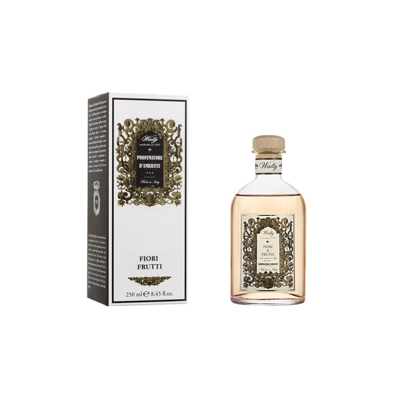 Un cornucopia colma di fragranze, abbondante e generosa, da offrire al proprio benessere e a quello di tutti colori che amiamo. Portare in casa la fragranza d’ambiente Fiori e Frutti di Wally 1925 sarà come godere della freschezza immutata nei secoli della Primavera del Botticelli o aprire una finestra sul giardino dell'Eden: le note del Limone, dell'Ananas, della Pesca Bianca danzano insieme ai profumi di Peonia, Violetta, Fresia, Gelsomino, Rosa Bianca e si sposano agli orientali Ylang Ylang, Ambra, Legno di Cedro, legno di Sandalo e Muschi Bianchi in una unione perfetta.