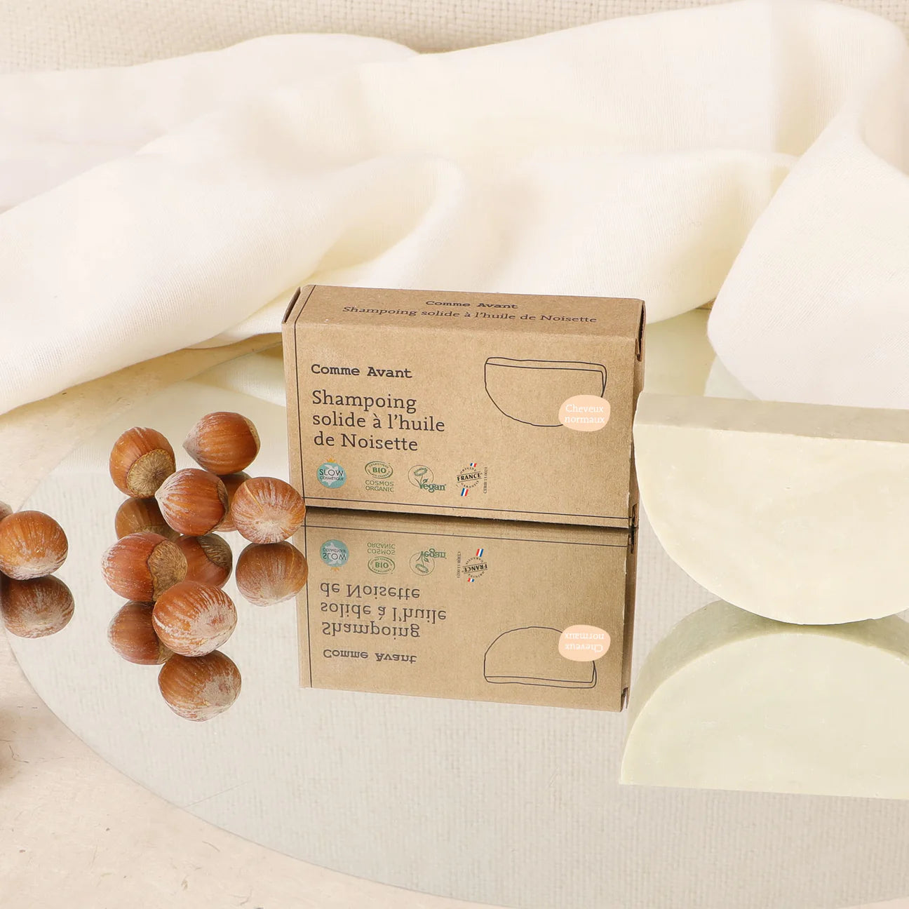 Il nostro shampoo solido (o shampoo) con olio di nocciola è universale e delicato. È adatto a tutti i tipi di capelli: normali, secchi, grassi, colorati, ecc. Non contiene solfati né siliconi.